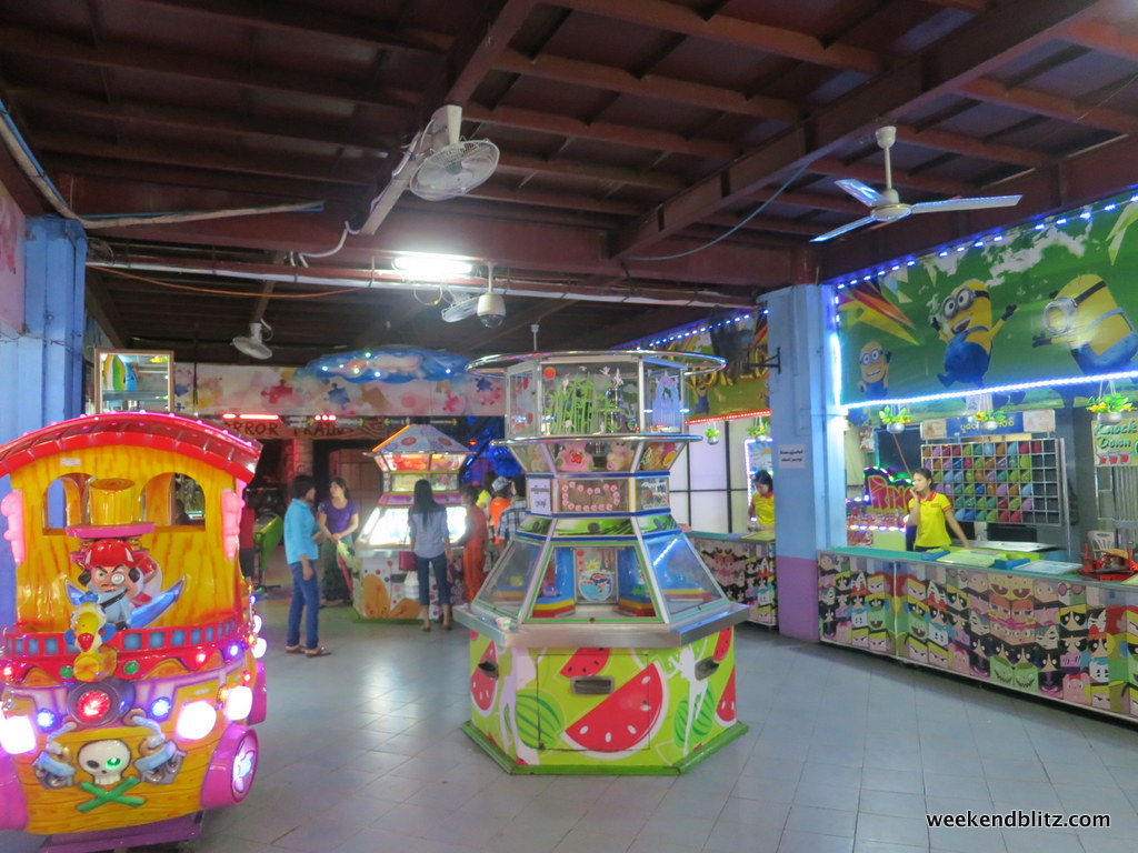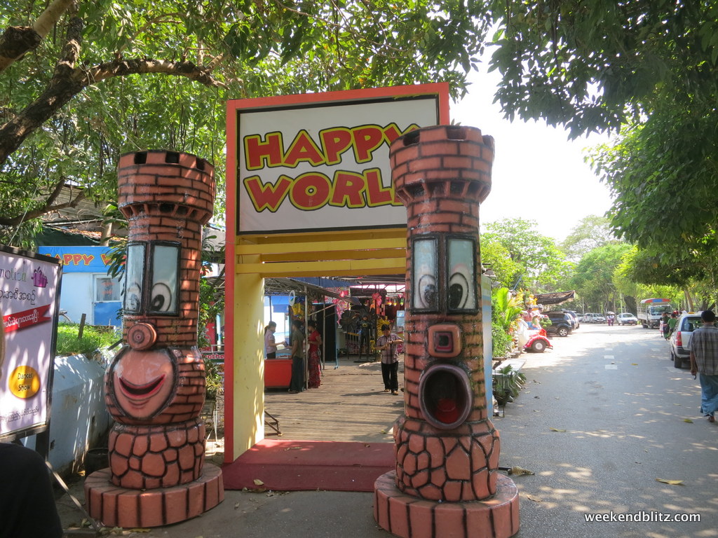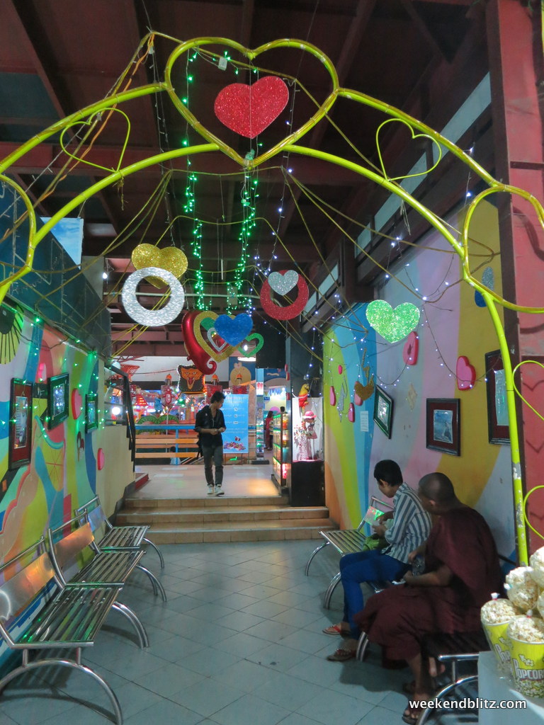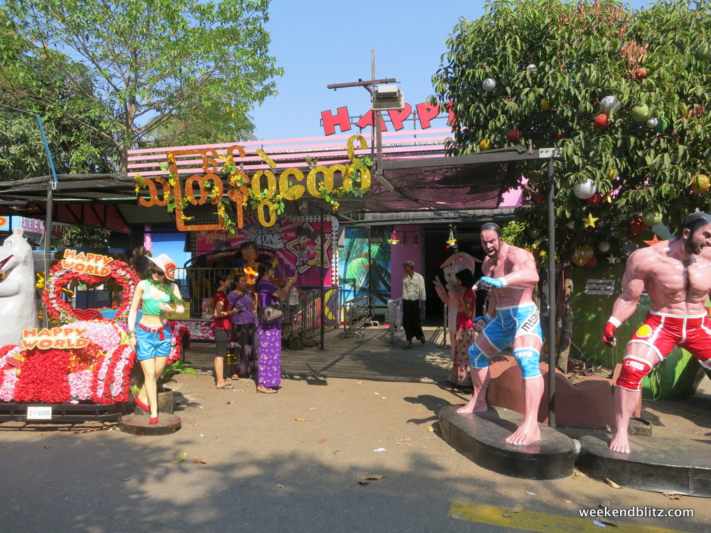 “Gangnam Style” then the Black Eyed Peas blared through a brightly colored blue metal contraction next to the street vendors offering ice cream. We’d stumbled straight into Happy World, a children’s amusement park just across the street from Shwedagon Pagoda. Bright lights and swings excited the children as they posed next to plastic monsters and super heroes. Then, we entered the dimly lit arcade and immediately were transported to Chuckie Cheese (just without the hassle of collecting tickets to win “awesome” prizes). We stepped into the outdoor café and ordered a lunch of fried cauliflower, som tam salad and kim chi rice with chicken – all for less that $5 USD total.