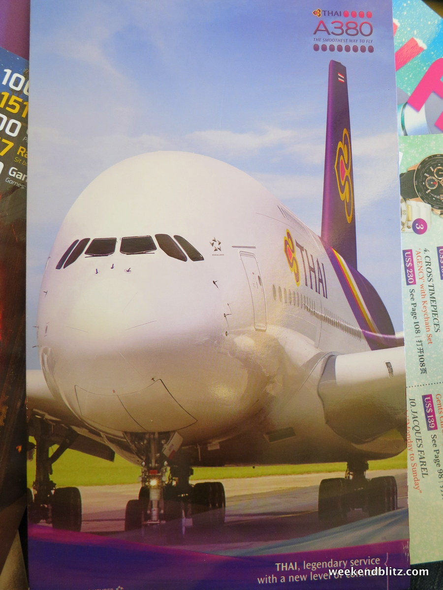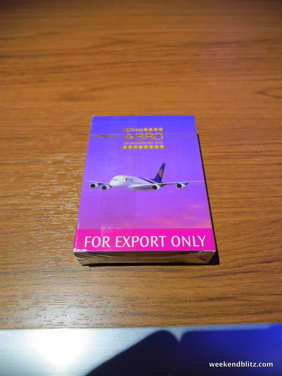 With breakfast (and all eating that I’d need to do for the next 3 days) out of the way, the flight attendants came around with souvenirs: Thai Airways A380 Playing Cards! I wonder if Airbus threw those in for free or if they had to pay for them on top of the $414.4 million for the plane.