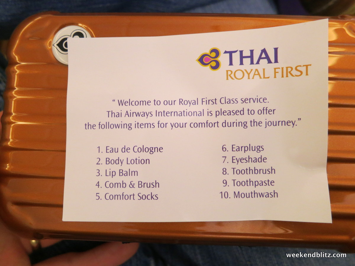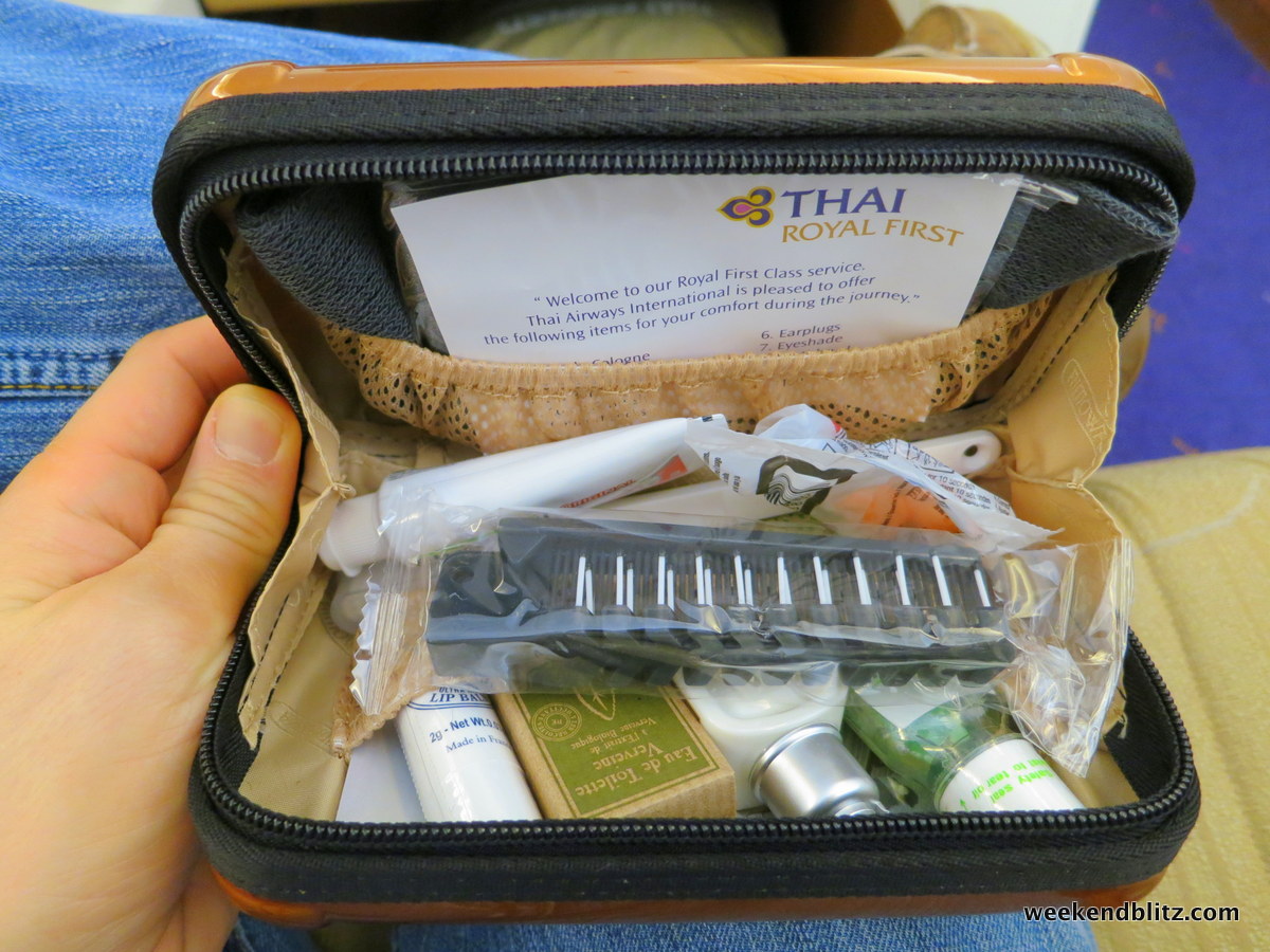 The seat is filled with magazines to read (including a Cosmo in German for McCown), pajamas, slippers, 2 comfortable pillows, headphones and an amenity kit. The Thai amenity kit was the same as 2 years ago and sort of weak: it was essentially the same exact case as Lufthansa but a little nicer.