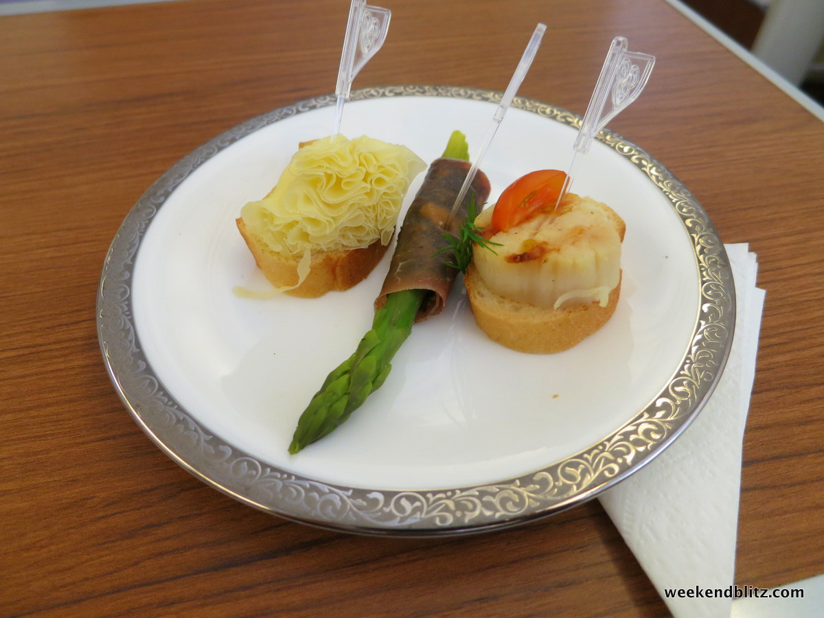 ~40 mins after take off: Once we were at cruising altitude and wasting no time, the crew came around to distribute the “First Serving”: Canapés.