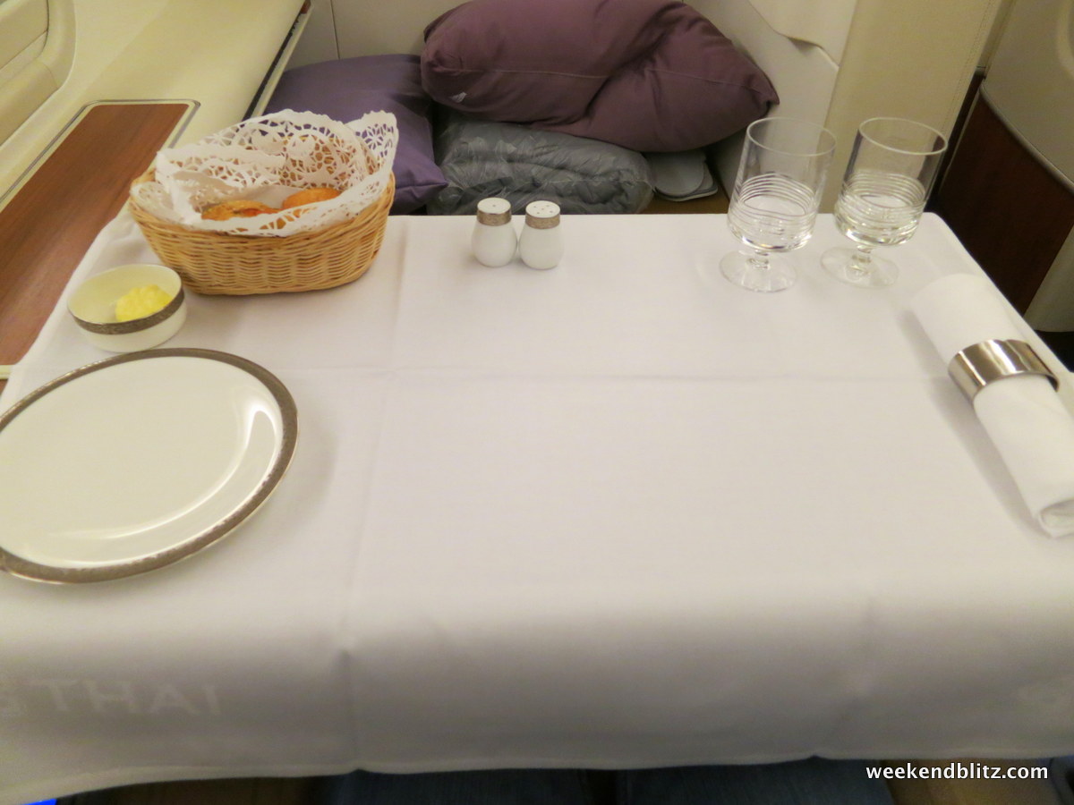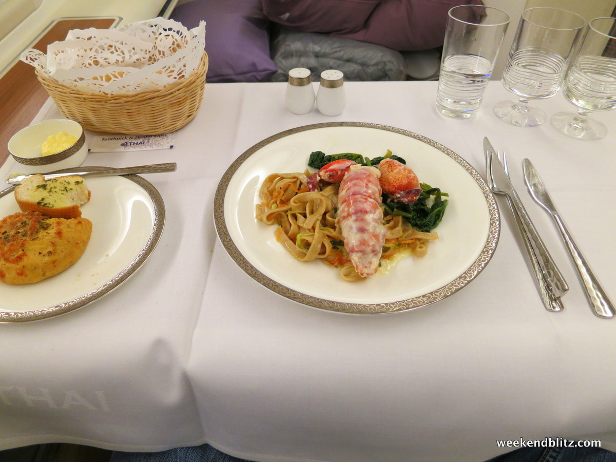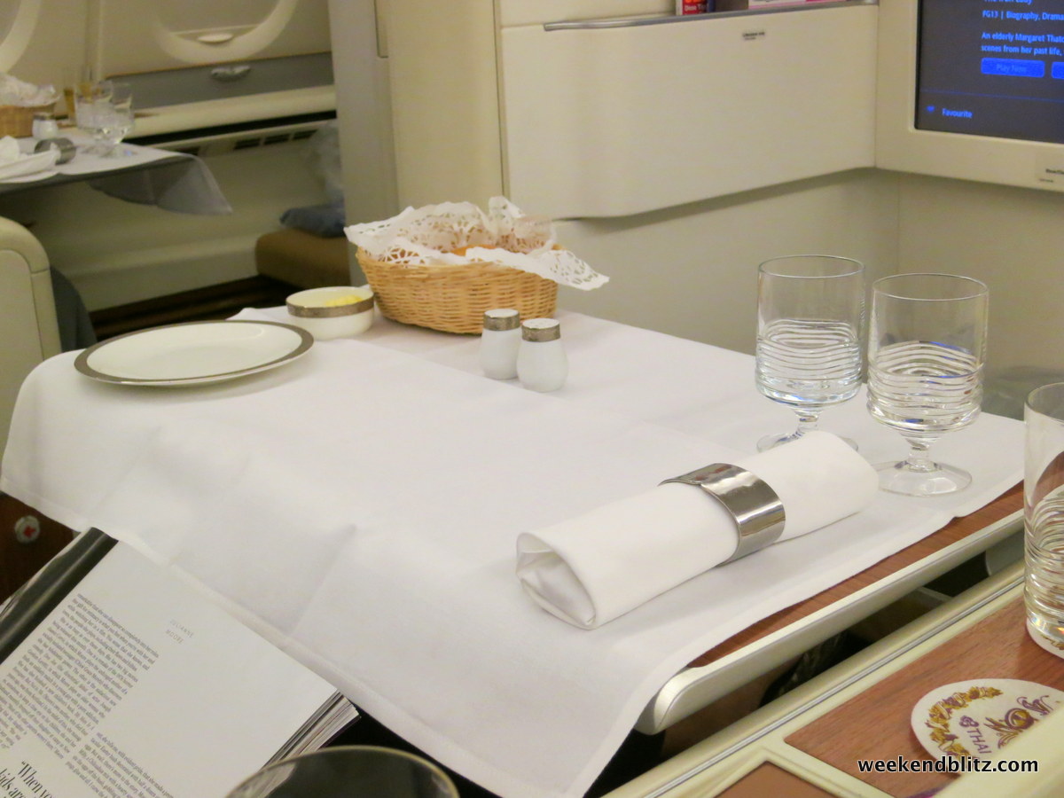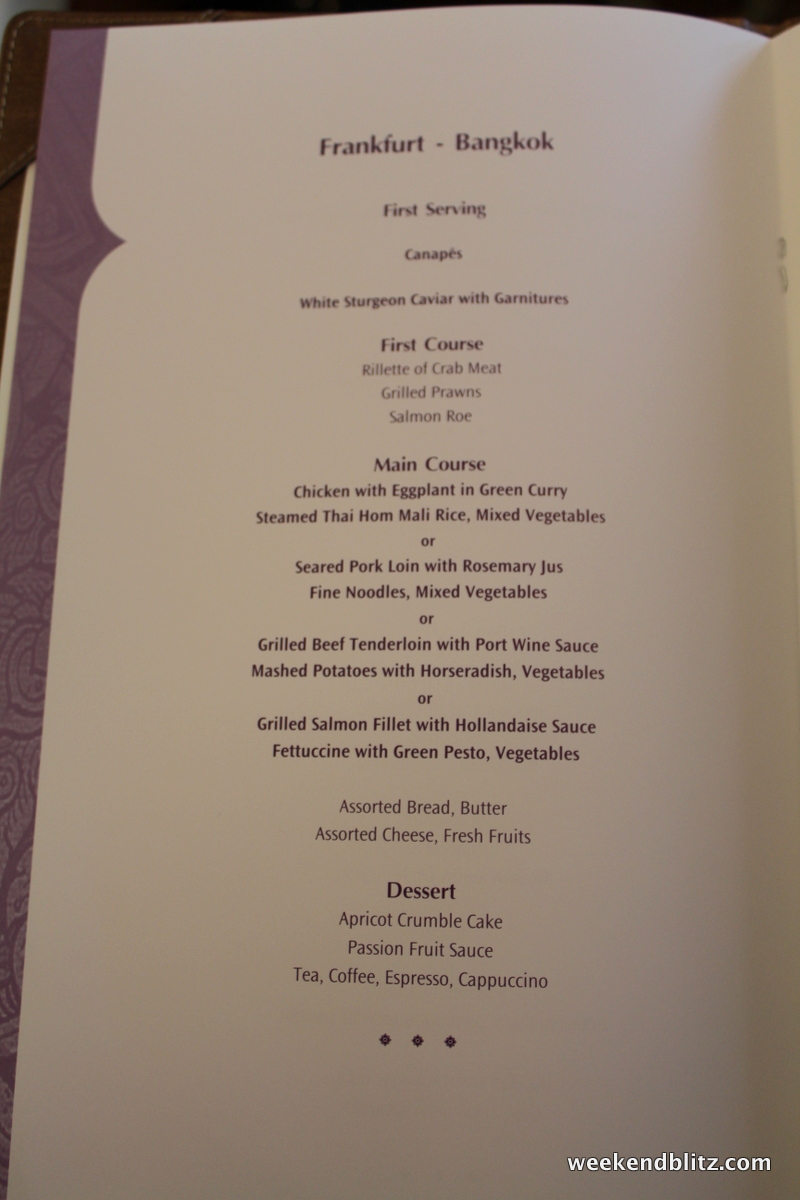 So how was the meal service overall? Since we’d just flown Lufthansa First Class the day before, we naturally drew all of our comparisons between the two carriers. Compared to the Lufthansa First Class experience, our Thai Royal First meal service felt a little rushed and mechanical. However, we found the Thai Airways flight attendants much friendlier and pleasant but that might just be my experience with Germans vs Thais.