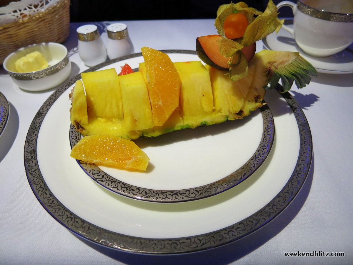 For this “Second Serving,” we enjoyed a first course of fresh fruits, yogurts, cereals and fresh juice. To our flight attendant, apparently asking for a “little bit of fruit” actually meant “give me an entire fricken pineapple.”