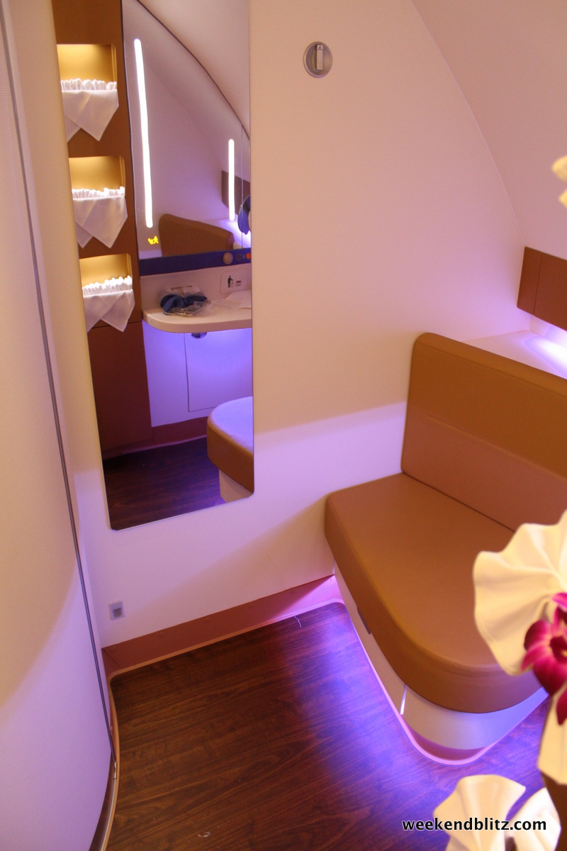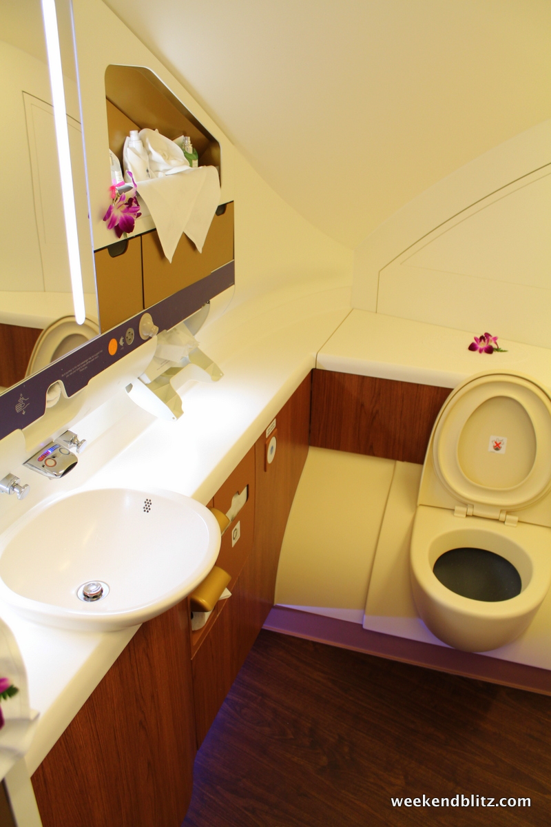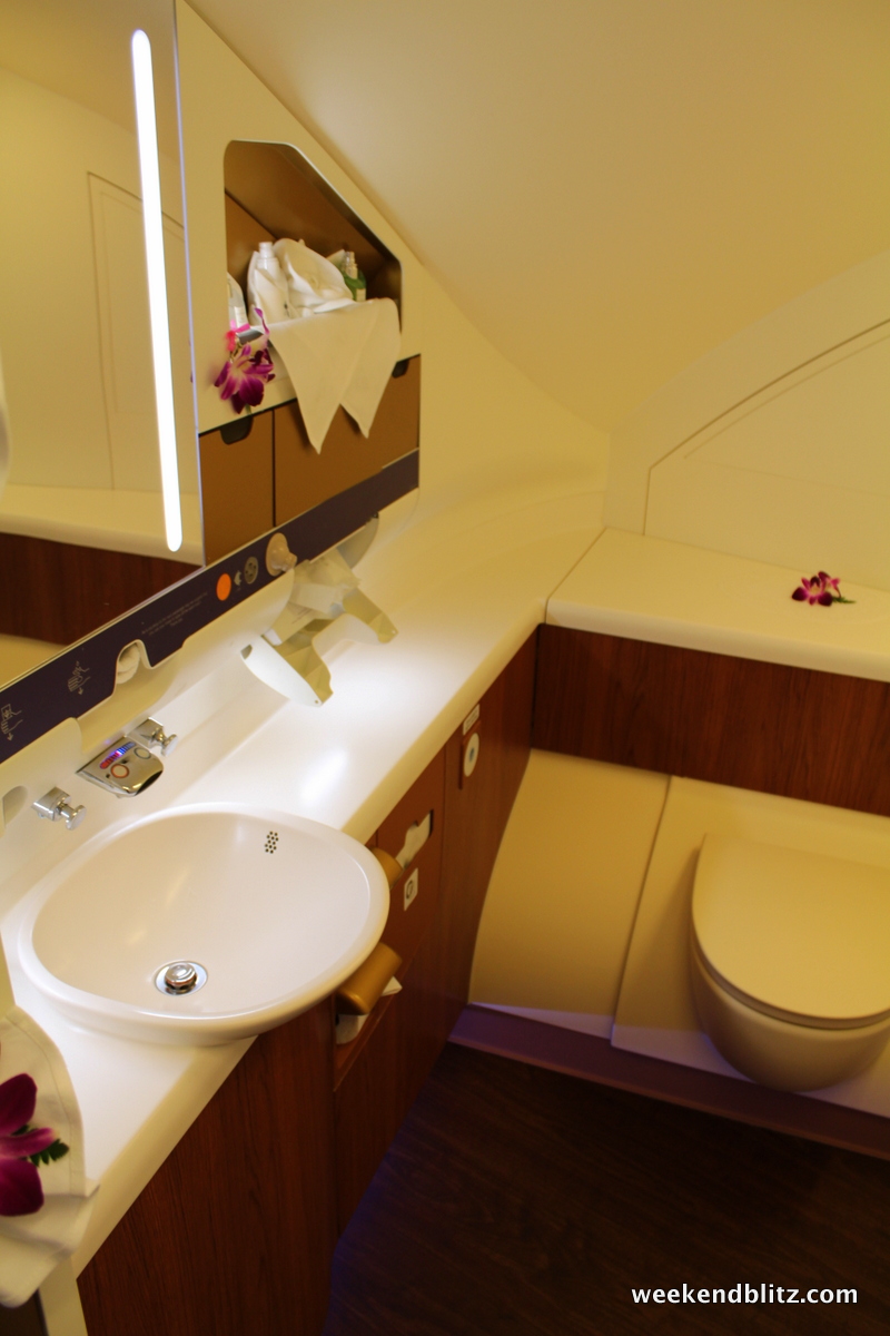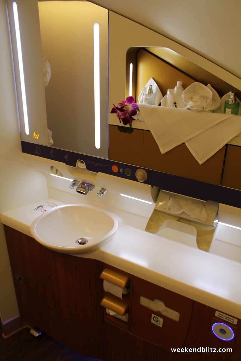 The bathroom was possibly the highlight of the trip. I’ve just never imaged one so spacious on an airplane. As you walk in, there is a small seating area and full length mirror. As I understand it, this is the space that a shower would have been installed, had Thai Airways opted to include one at the factory.