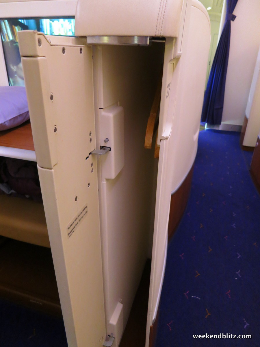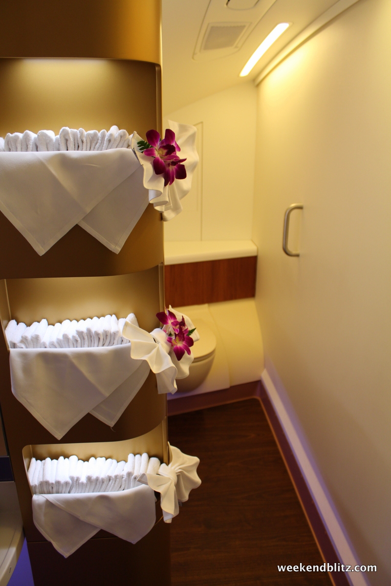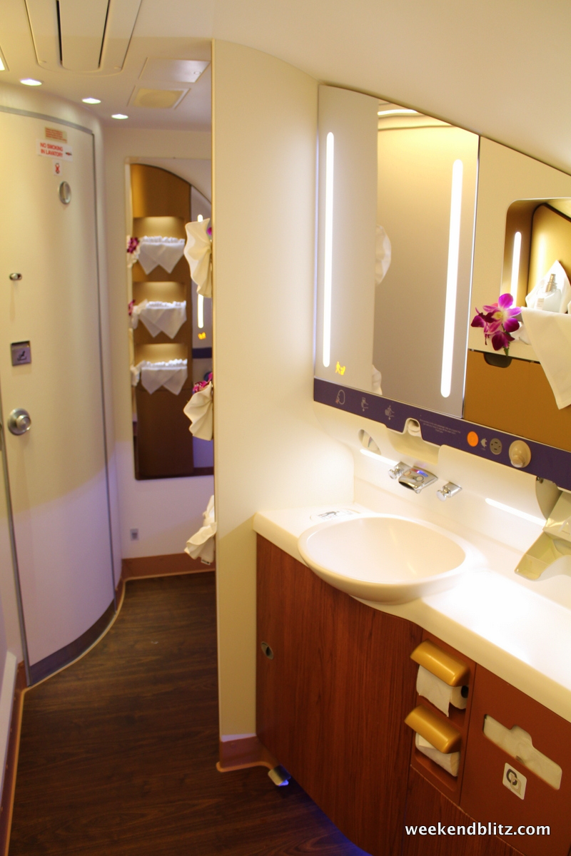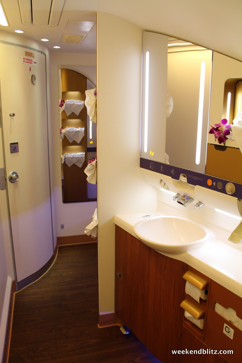 The bathroom was possibly the highlight of the trip. I’ve just never imaged one so spacious on an airplane. As you walk in, there is a small seating area and full length mirror. As I understand it, this is the space that a shower would have been installed, had Thai Airways opted to include one at the factory.
