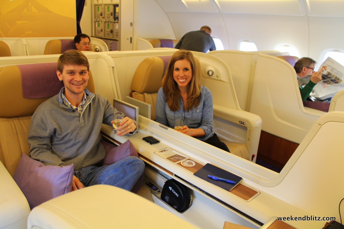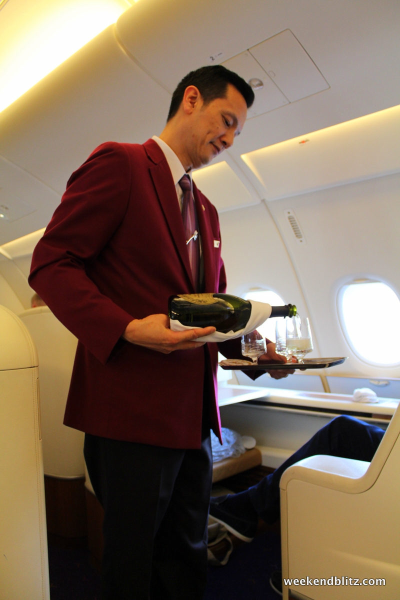 Next up, the pre-departure champagne was flowing. I don’t know what was better, that technically this was honeymoon champagne, that it was Dom Perignon (and I’m accustomed to drinking the cheap stuff) or that it was being served to us at the beginning of our Thai Royal First experience… but this stuff tasted tasted extra good.