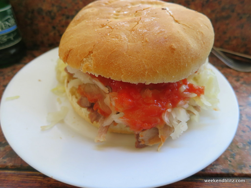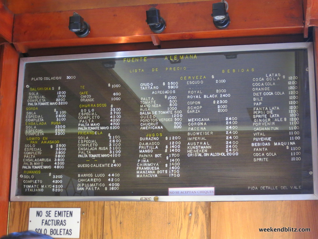 We went with the popular Lomito Completo, complete with mayo, sauerkraut and salsa (3,800 CLP). Our gigantic sandwich came out within 4-5 minutes, and we dove right in. It’s more like a meat sandwich with a giant mayo salad on top. Most of the locals had guacamole on theirs, making me immediately envious. Can’t deny the freshness at this place, though.
