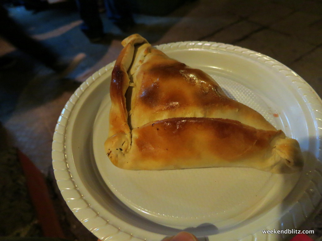 We then bought our (very overpriced?) sopaipilla. He threw on some salsa picante and other mustard-based sauce and we gave it a try — and it was tasty but tasted more like fried dough than squash. Maybe the squash is just minced in together with the dough?