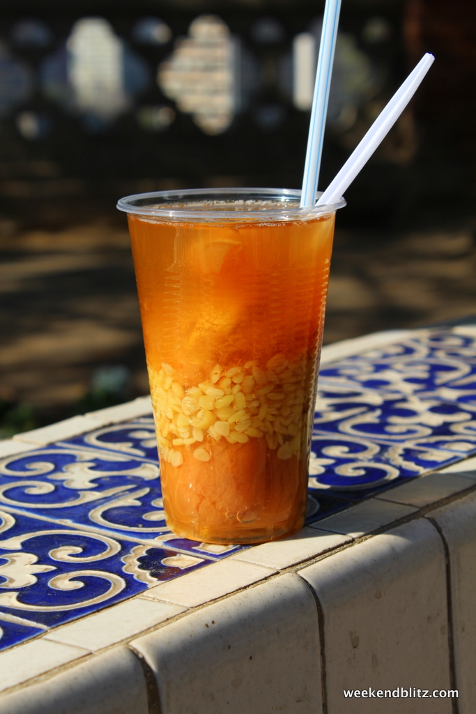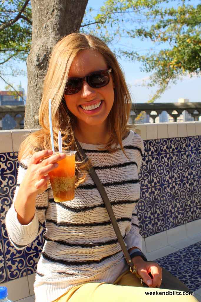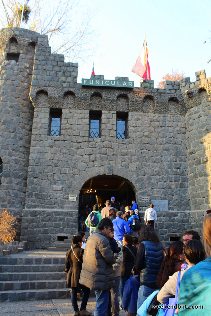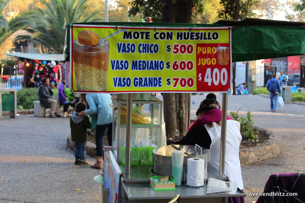 Although there’s not much to do along the way, there is a beautiful yellow fountain on the way up and an opportunity to try a decidedly Chilean drink: the Mote Con Huesillos (700 CLP). It’s a chilled peach nectar juice with cooked wheat kernels and a whole, sugar soaked peach. It was delicious and very, very sweet. At first, we thought it was apricot-flavored and were pretty skeptical — mixing odd juices with odd fruits and ever stranger grains and/or beans– we just weren’t sure about it. Once we dove in, it was super flavorful and quite filling given all the wheat kernels.
