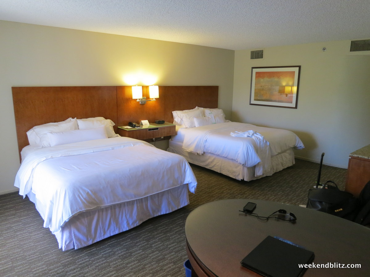 I booked a 2 Queen room and, despite there being a large conference for the next few nights and the Coachella music festival starting on the weekend, rooms were still available for for the length of my stay. The agent said that they were able to give me an “upgrade” to a Deluxe golf course view room (Deluxe golf, non-smoking: 2 Queen Beds, 525 sq ft / 49 m²) but, after I asked, said that a suite upgrade wouldn’t be possible due to the high occupancy. I confirmed this on the Starwood app: a suite with 1 king and a sofa bed was available but all of the 2 queen suites were sold out. At check-in, they gave me a voucher for a “special gift” to be picked up with the concierge.
